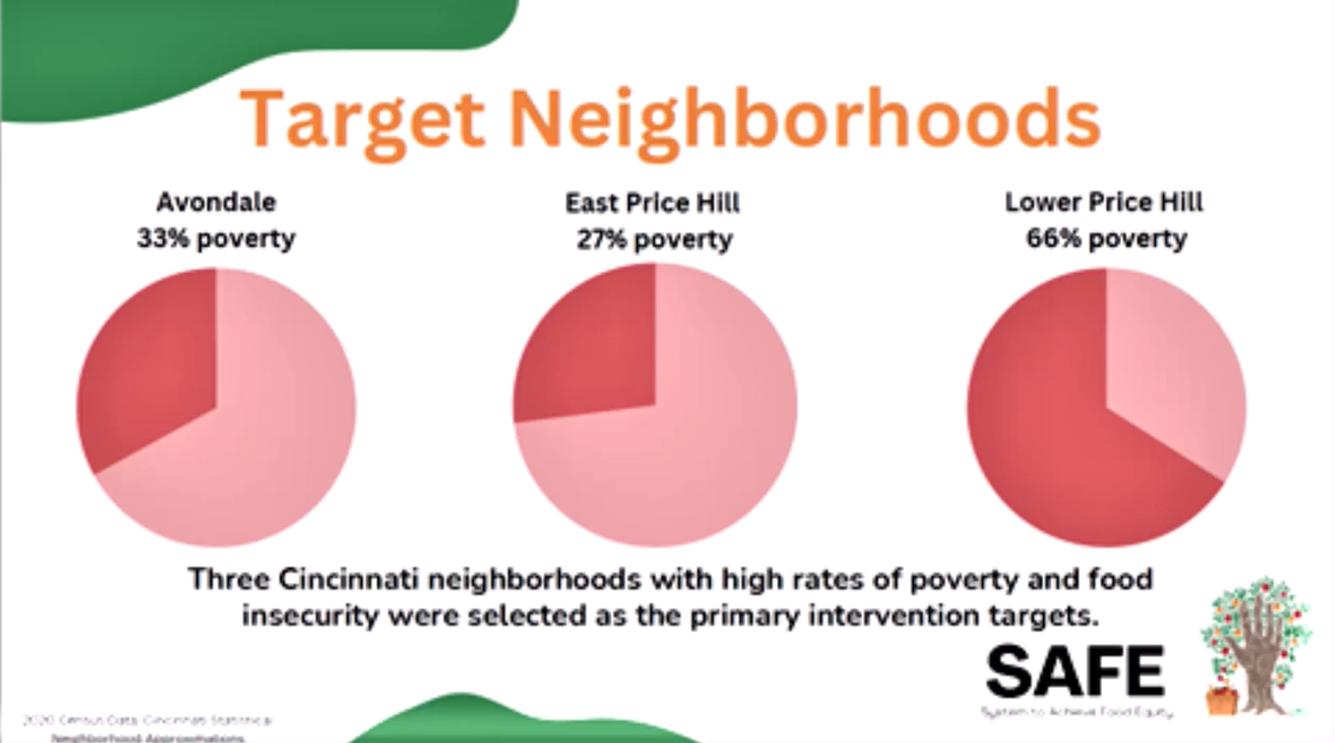 Inequity in food security is a massive, long-standing, deeply rooted, and urgent problem here in Cincinnati, Ohio, as in many other U.S. cities. Many factors drive food insecurity and inequity, including political, social, and logistical challenges and its elimination will require multiple points of intervention at multiple levels, from community to policy levels.